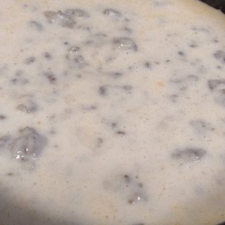 1. Brown & seasoned ground sausage 2. Sprinkle cornstarch or flour to soak up the fat 3. Drown sausage cornstarch mixture in milk 4. Add more cornstarch/flour or more milk until your gravy consistency is reached. 5. Drown biscuits with supreme sausage gravy