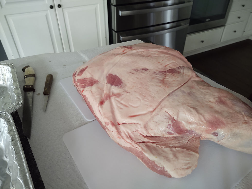 I like to start fat/skin side up. I start by wiggling the hock, while pressing firmly to feel where the joint is. Then, with the long knife I slice through, with hope, the blade finds the joint. I ensure long, steady slices around the bone.