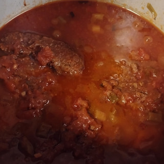 I started off by browning 1lb of breakfast sausage on the sear setting. I mixed in a bushel of diced green onions and 1 lb of diced potatoes. I topped off the pot with one jar of extra garlicky pasta sauce & use the same jar to throw an equal amount of hot tap water water in.