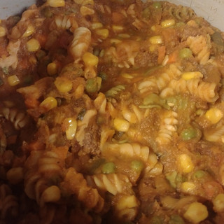 I decided to fortify it with some tri-colored vegetable based rotini pasta. Then, threw in a bag of Frozen peas, green beans, corn and carrot medley.